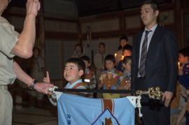 お腹いっぱい食べて、キャンプファイヤーでは「火の女神」から優しさ・勇気・知恵の火をもらったスカウトたち。
