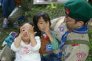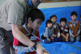 風船人形の何とも言えない不思議な触感に子供たちは夢中でにぎにぎにぎにぎ…夕食は、キャンプといえばカレー。準備をしてくれた団委員の皆さん、ありがとう。 |